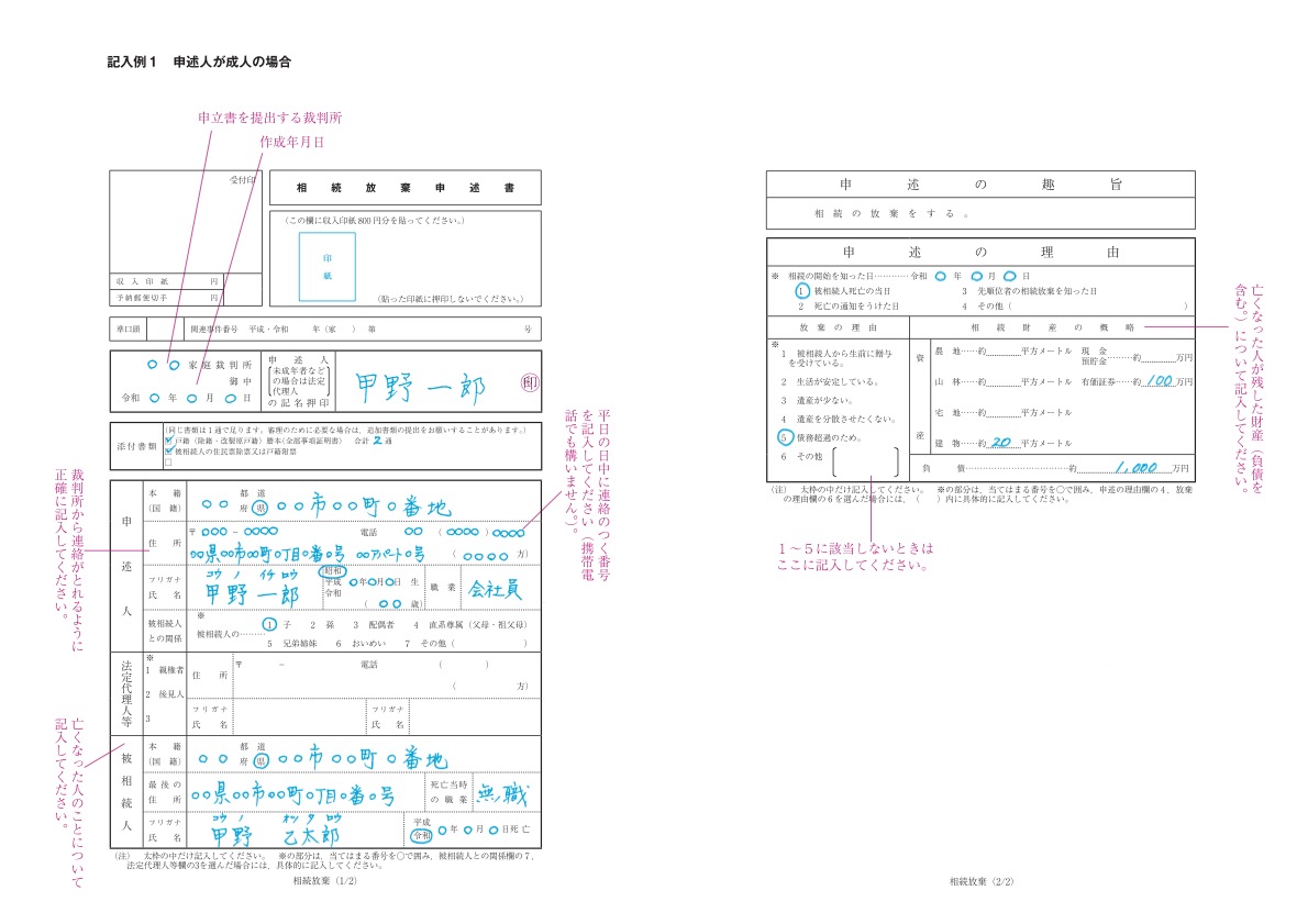 相続放棄するには、家庭裁判所で申述する手続きが必要です。その際、申述書に収入印紙800円分を貼付するほか、連絡用郵便切手を500円分程度納付する必要があります。