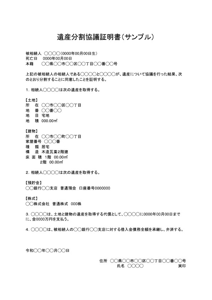 「遺産分割協議証明書」とは、各相続人が遺産分割協議の内容を証明する書類です。遺産分割協議で合意した内容が記載されます。