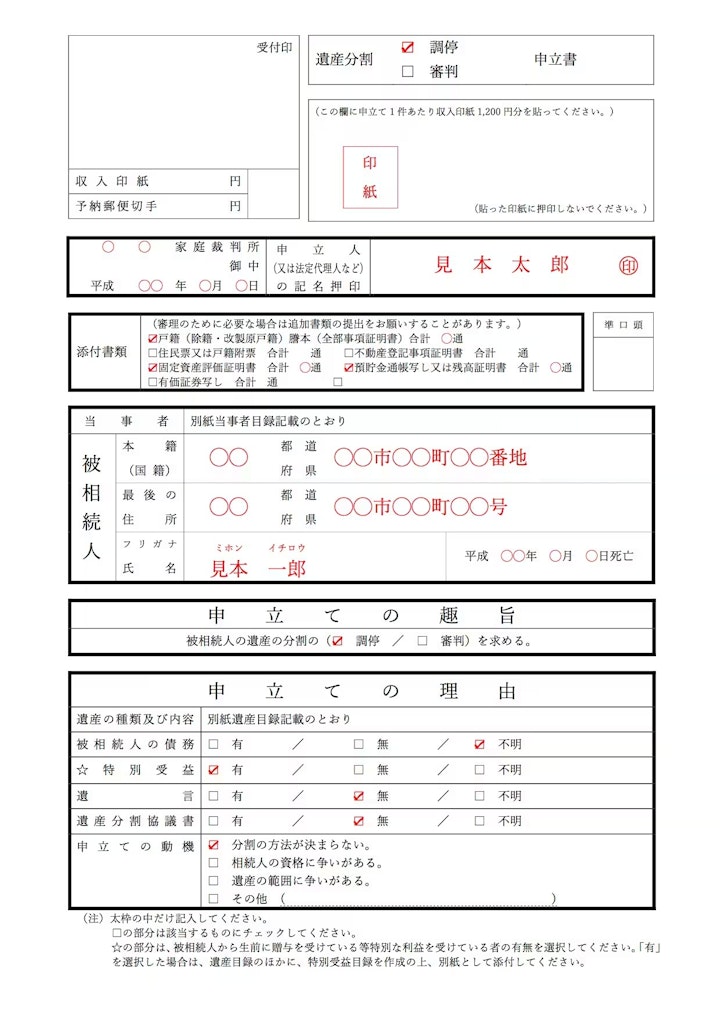 遺産分割調停の申立書は裁判所のサイトからダウンロードできます。記載例は以下のとおりです。