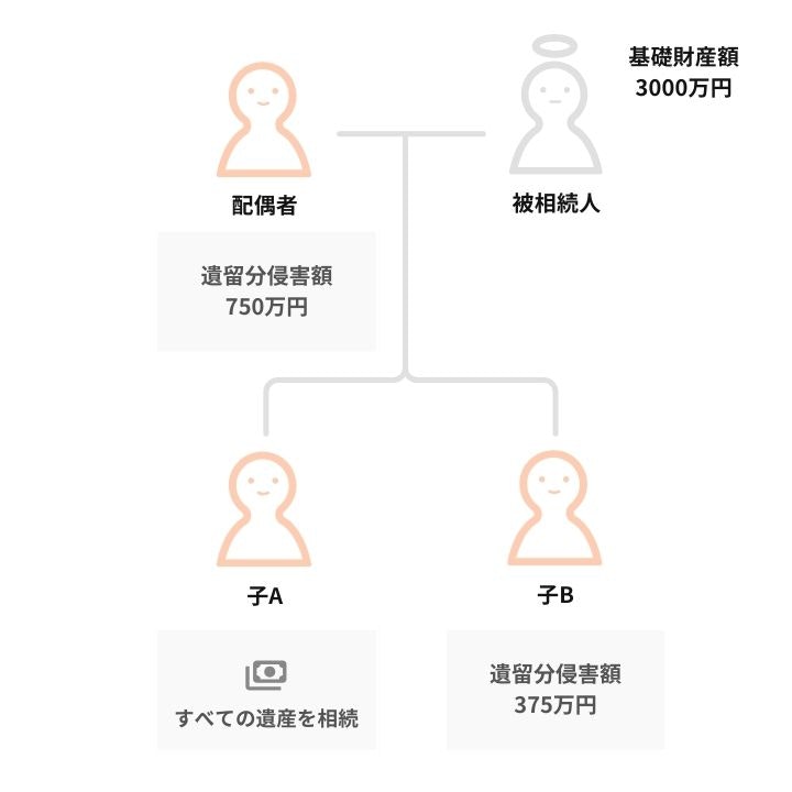 →配偶者の遺留分侵害額は750万円(=3,000万円×4分の1)、子Bの遺留分侵害額は375万円(=3,000万円×8分の1)
