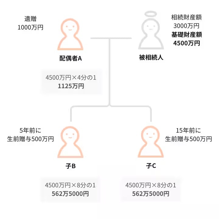 遺留分の基礎財産に当たるのは、相続財産3000万円、Aが受けた遺贈1000万円、Bが受けた生前贈与500万円の計4500万円