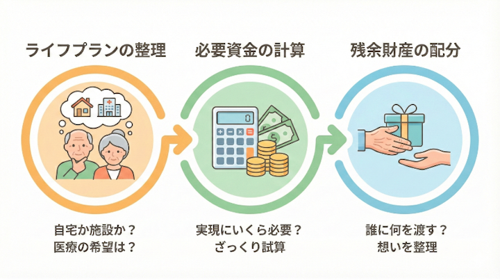 ・ライフプラン: 「老人ホームに入る?それとも自宅で過ごす?」「どんな医療を受けたい?」など、希望を整理する。