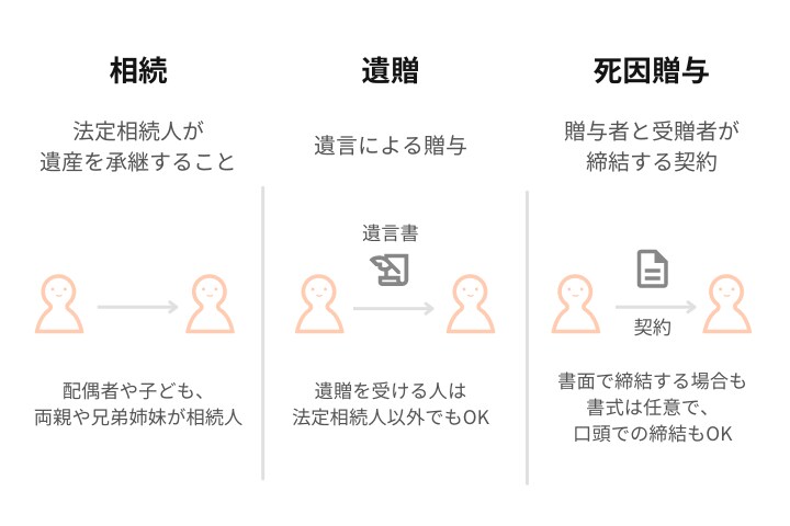 遺贈は、同じく本人の死亡を機に親族などへ遺産を承継する、「相続」や「死因贈与」と対比されることがあります。