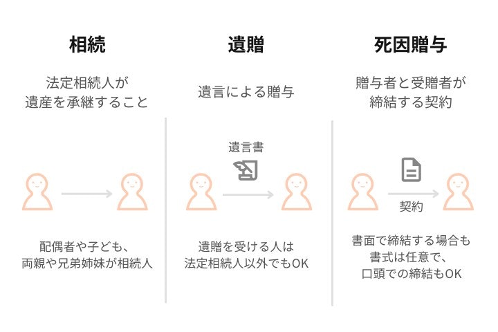 遺贈と相続の違い、および遺贈と死因贈与の違いは、それぞれ以下のとおりです。