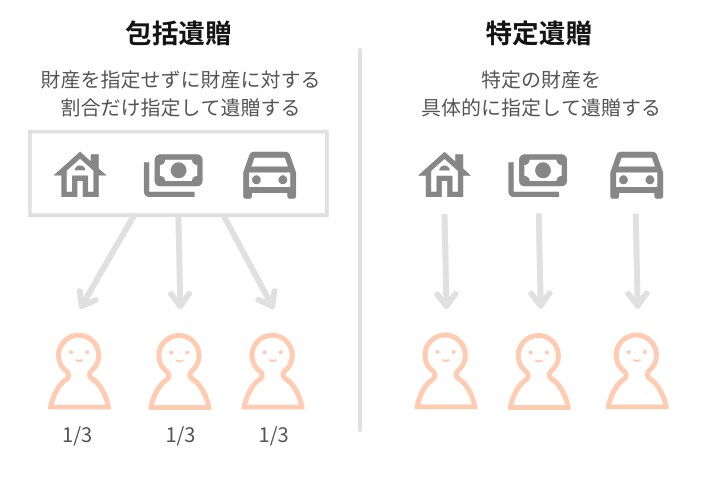 特定の財産を具体的に指定して遺贈することを特定遺贈、財産を指定せずに財産に対する割合だけを指定して遺贈することを包括遺贈といいます。