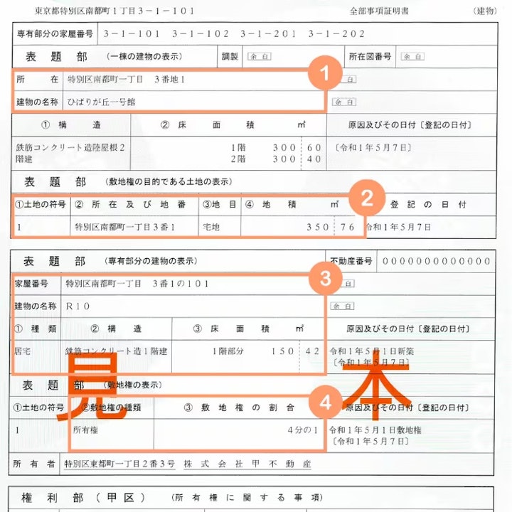 マンションの場合には、一棟の建物、敷地権の目的である土地、専有部分の建物、敷地権についてそれぞれ記載します。