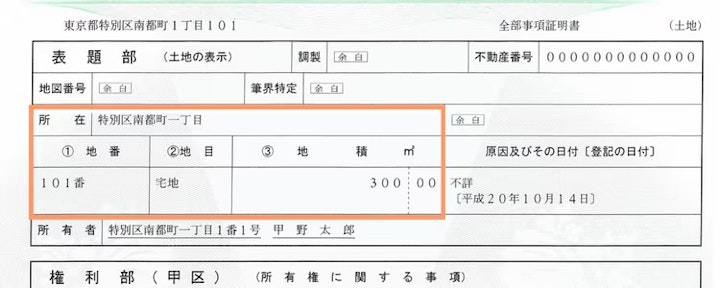 土地の場合は、所在、地番、地目、地積を記載します。 共有の場合には、上記に加えて、共有持分も記載します。