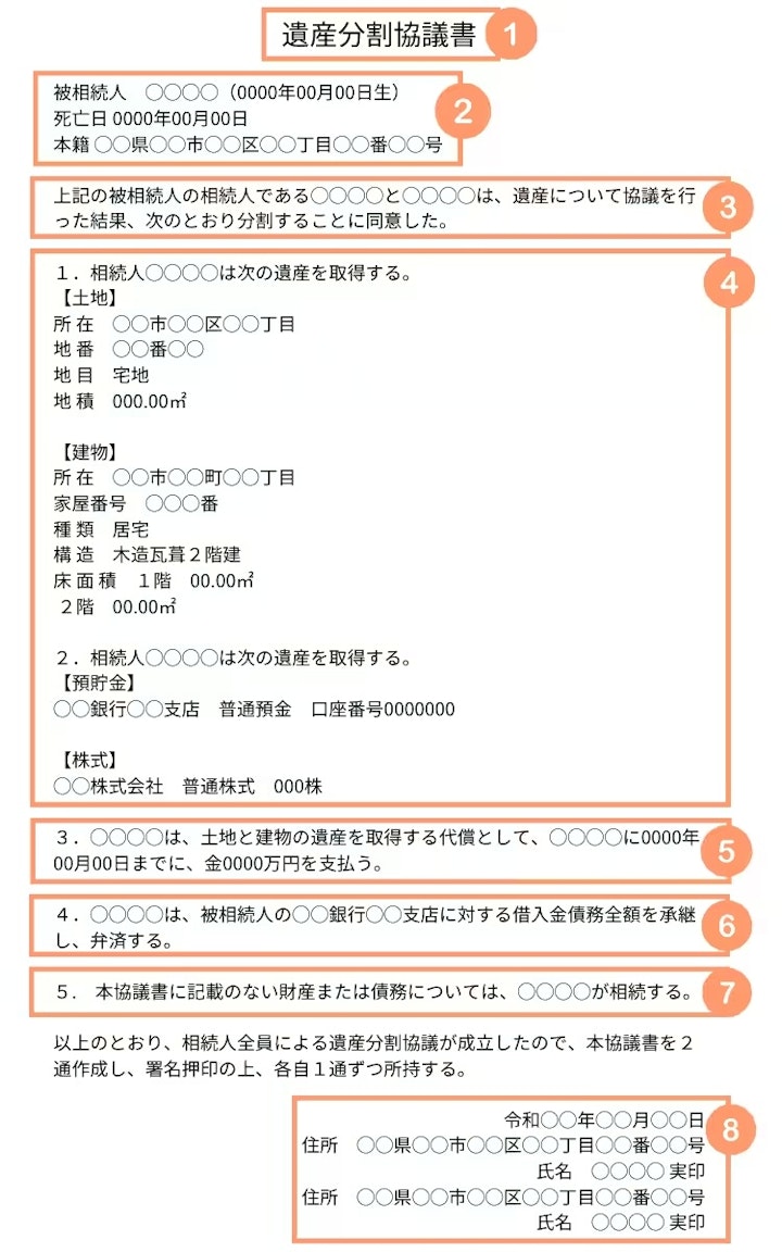具体的には、「上記の被相続人の相続人である◯◯◯◯と◯◯◯◯は、遺産について協議を行った結果、次のとおり分割することに同意した。」などと記載します。