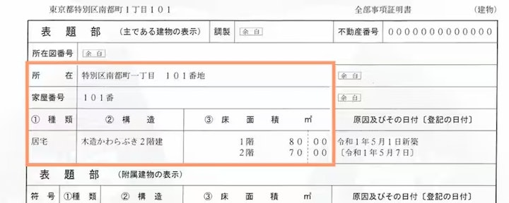 建物の場合は、所在、家屋番号、種類、構造、床面積を記載します。