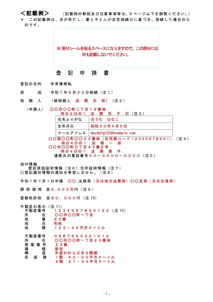 相続登記の申請を行う際には、登記申請書を作成する必要があります。 登記申請書の書式は、法務局ウェブサイトに掲載されています。作成に当たっては、以下の記載事項を参考にしてください。
