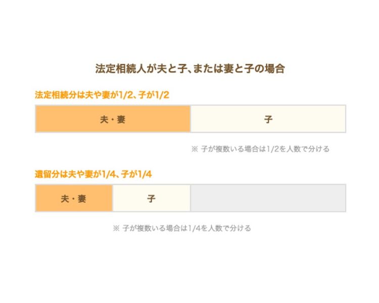 →配偶者の遺留分割合は4分の1(=2分の1×2分の1)、 子2人の遺留分割合は各8分の1(4分の1の遺留分を2人で分ける)
