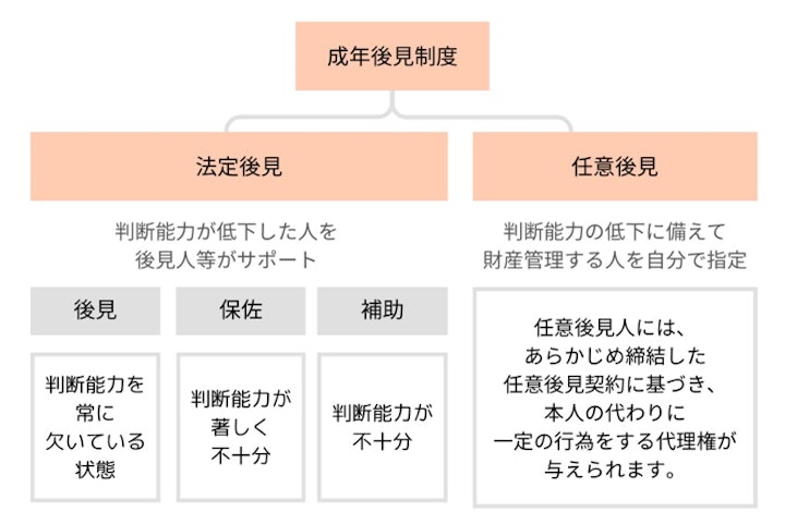 任意後見制度の目的は、将来本人の判断能力が低下する事態に備えて、あらかじめ信頼できる人に財産管理などを任せられるようにすることです。 任意後見人には、あらかじめ締結した任意後見契約に基づき、本人の代わりに一定の行為をする代理権が与えられます。