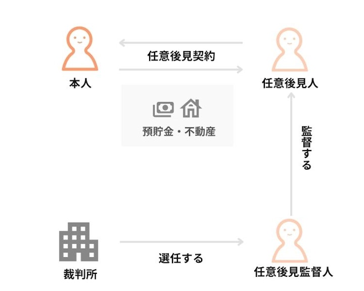 任意後見制度では、「任意後見人」と「任意後見監督人」が本人の財産管理などに携わります。