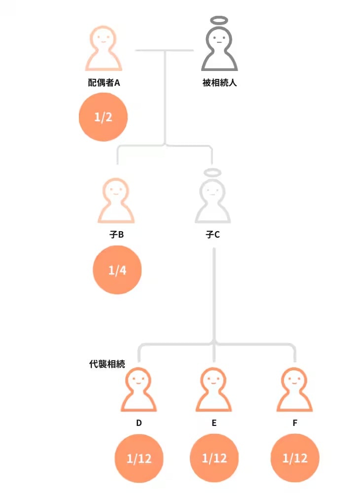 (例)配偶者A、子B、子Cの3名が法定相続人であったところ、被相続人が死亡する前にCが死亡し、Cの子であるD・E・Fが代襲相続人となった場合の法定相続分