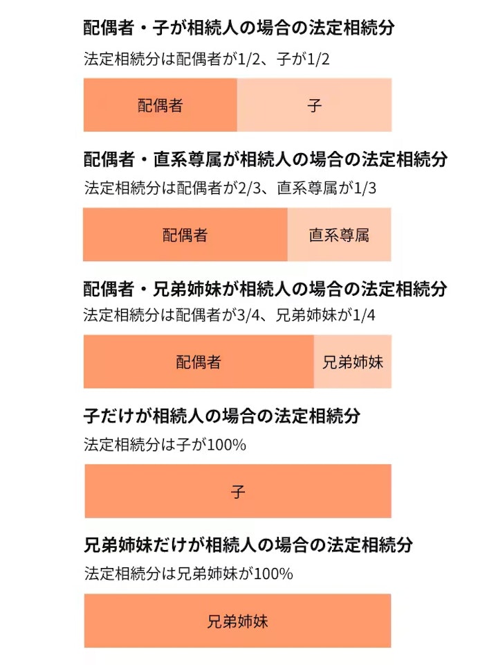 ※兄弟姉妹が複数いる場合は、人数に応じて均等に法定相続分を按分します。ただし、被相続人と父母の一方のみを同じくする兄弟姉妹(=異父兄弟姉妹・異母兄弟姉妹)の法定相続分は、被相続人と父母の双方を同じくする兄弟姉妹の2分の1です。