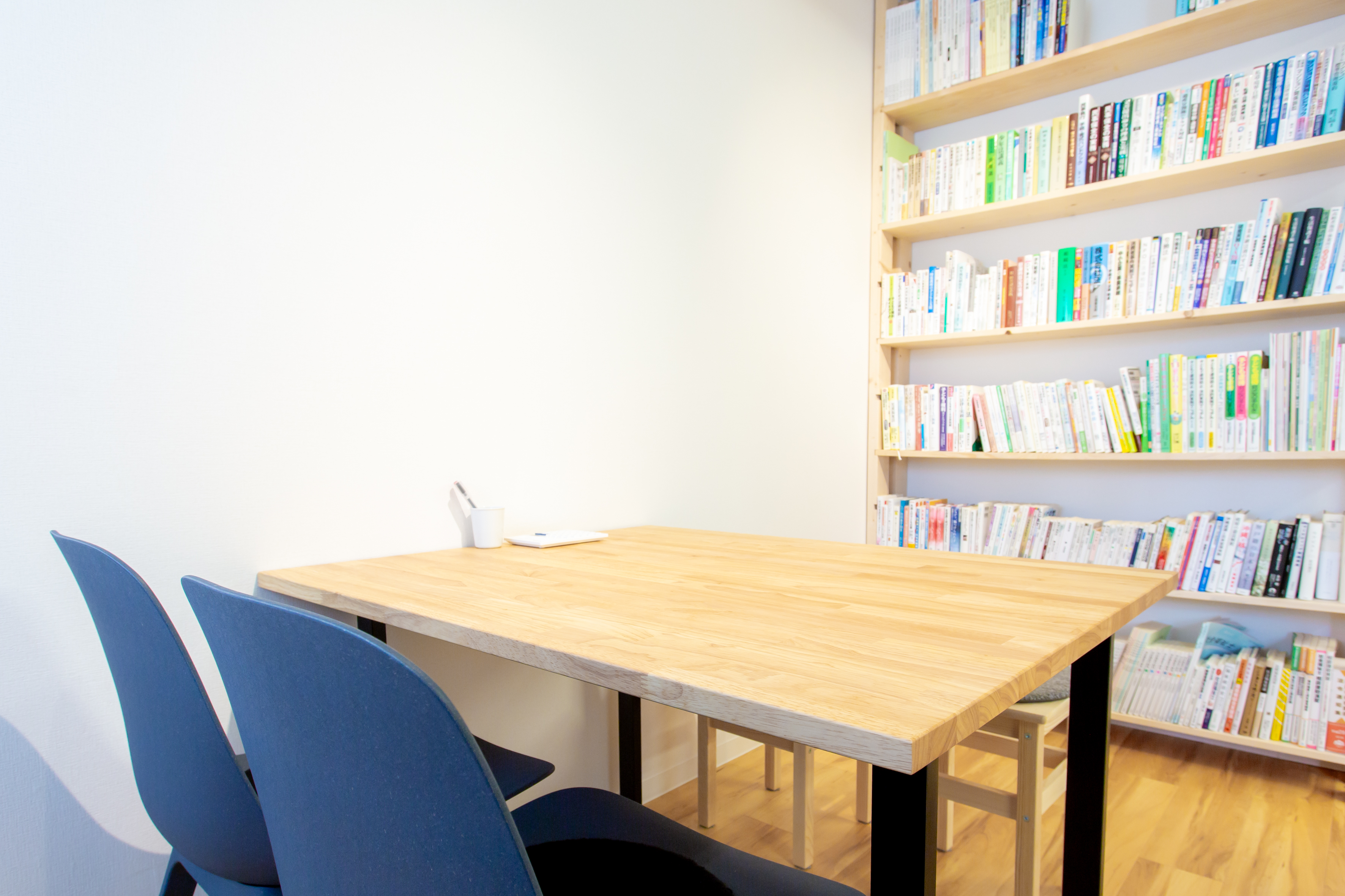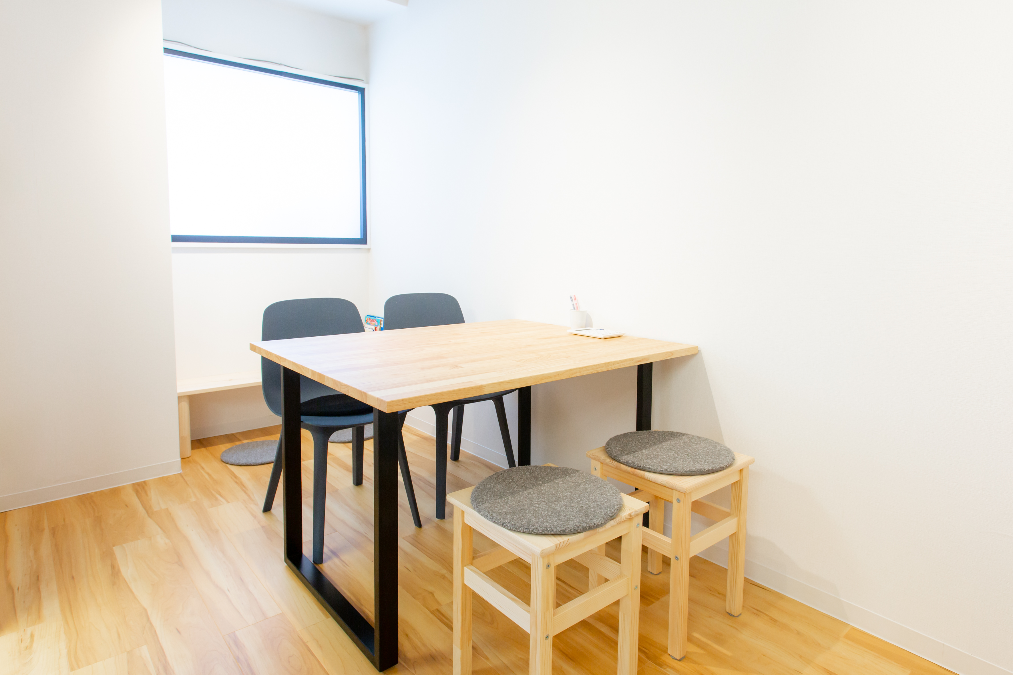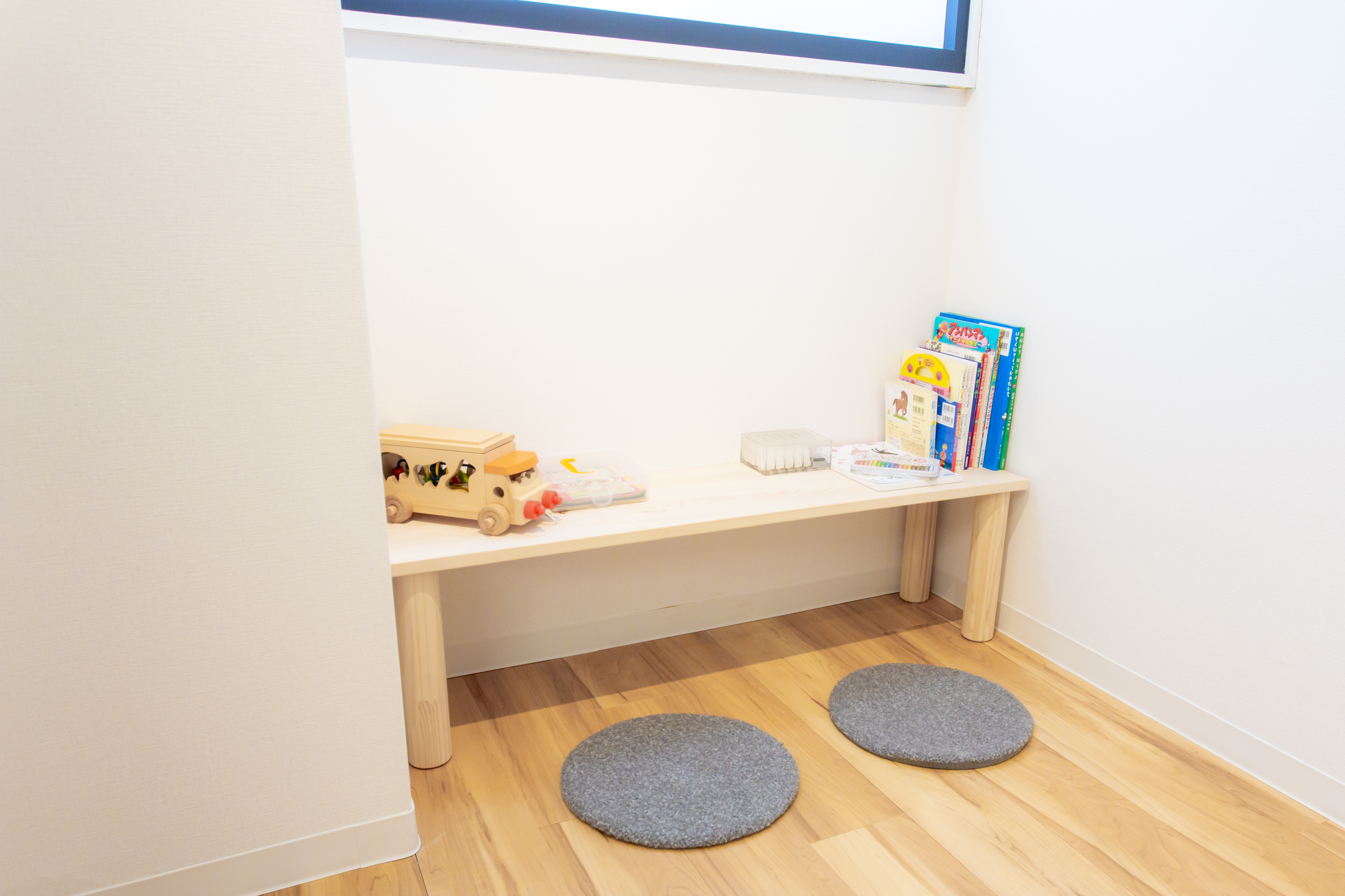 事務所の内装も広々とした作りで、木製の家具などを使っています。小さなお子さんがいらっしゃる方も多いので、キッズスペースも作りました。